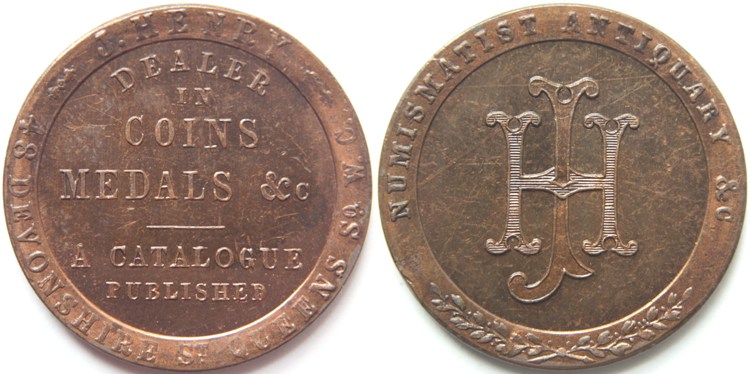 J. Henry's London (Middlesex) halfpenny token undated. Obverse: Ornamental cypher in centre: "JH" with legend: "NUMISMATIST ANTIQUARY &c". Reverse: Legend on six lines in centre and round periphery: "J. HENRY - DEALER IN COINS MEDALS &c - A CATALOGUE PUBLISHED - 48 DEVONSHIRE ST. QUEENS SQ. W. C.". Plain edge. J. Henry was a Coin Dealer with a business in London. Comes with old collectors ticket. Proof-like with reflective surfaces and light hairlines, nicer than photograph. Withers TB3 No: 3044, Bell Middlesex Appendix No. 2. Diameter 30.00mm. (↑↑) AUNC. £40.00 e-mail David at enquiries@abccoinsandtokens.com to order. |