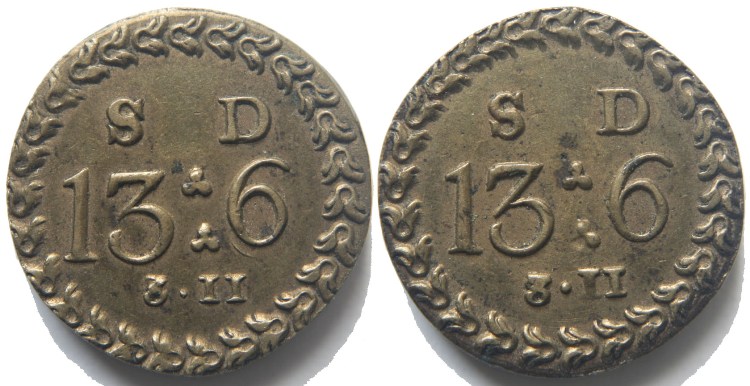 Scarce George III half moidore brass coin weight by Berry, Birmingham, listed in Withers' "British Coin Weights" as "SCARCE". Good collectable condition, see photograph. Withers No: 1750f. Weight 83.30gr. Diameter 17.9mm. VF+. £30.00. e-mail David at enquiries@abccoinsandtokens.com to order. |