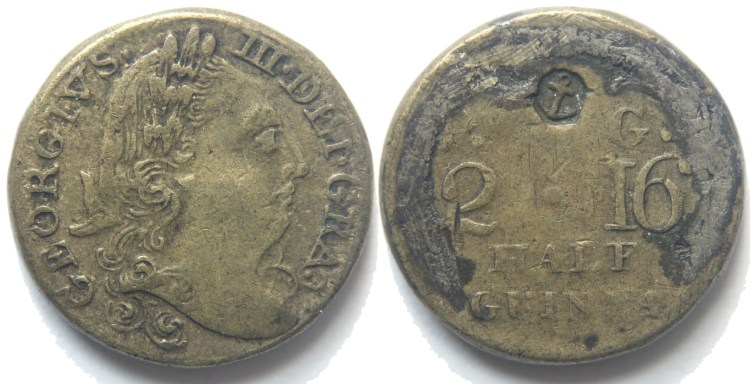 George III portrait brass half guinea coin weight with anchor countermark. Reasonable collectable condition, see photograph.