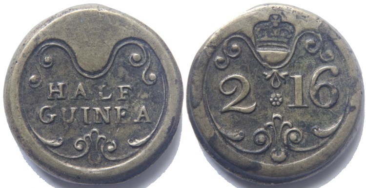 George III brass half guinea coin weight with crown countermark. Good collectable condition, see photograph. Withers No: 1967G. Weight 63.92gr. Diameter 16.3mm. VF. £30.00. e-mail David at enquiries@abccoinsandtokens.com to order. |