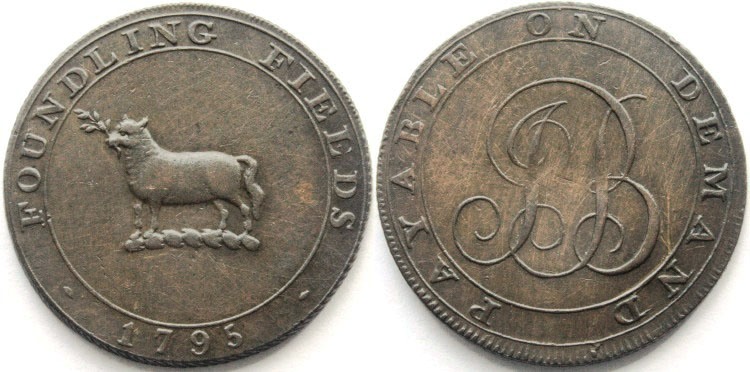 Foundling Fields London (Middlesex) copper halfpenny token dated 1795. Obverse: A crest consisting of a standing lamb with a sprig of laurel in it’s mouth with legend: "FOUNDLING FIELDS 1795". Reverse: A cypher of "JB" in script capitals with legend: "PAYABLE ON DEMAND". Diagonally milled edge. This was issued by J. Burton and, as it was underweight, the profits probably went to the Foundling Charity Hospital which was set up by Thomas Corham, a ship owner in the American trade. Corham was distressed by the sight of ill and dying children on the streets of London and struggled for seventeen years to establish the institution which was eventually granted the Royal Charter in 1739. The hospital was built on The Lamb’s Conduit Estate shortly afterwards in 1741. A basket was hung outside the front door to receive unwanted babies, with a bell-rope nearby for the unfortunate mother to call attention to the infant. Both Hogarth and Handel also supported the hospital. Good collectable condition with the usual reverse die flaw barely developed, see photograph. D&H Middlesex No: 305. Diameter 27.5mm. VF-. £25.00 e-mail David at enquiries@abccoinsandtokens.com to order. |