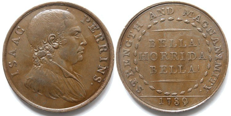Isaac Perrins Birmingham (Warwickshire) copper penny token dated 1789. Obverse: Bust to right with legend: “ISAAC PERRINS.”. Reverse: Legend: “BELLA! HORRIDA! BELLA!” within circle of leaves with: “STRENGHT AND MAGNANIMITY” around it and date: “1789” in exergue. Plain edge. Isaac Perrins was a prize-fighter and fought Thomas Johnson at Banbury. Good collectable condition, neatly lacquered in the past, see photograph. D&H Warwickshire No: 13. Diameter 34.5mm. VF. £60.00 e-mail David at enquiries@abccoinsandtokens.com to order. |