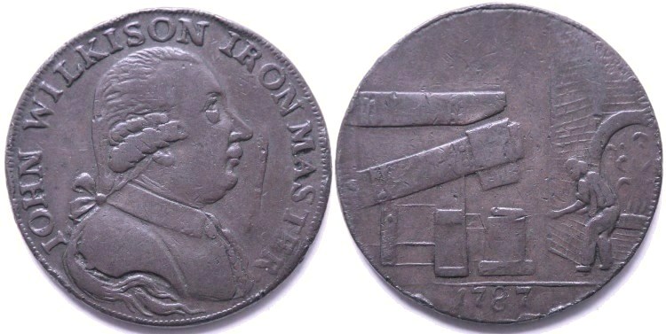 Counterfeit Wilkinson's (Warwickshire) copper halfpenny token dated 1787. Obverse: Bust of John Wilkinson with his name misspelt in legend: “IOHN WILKISON IRON MASTER.”. Reverse: The interior of a smithy showing a large drop hammer and a workman holding a piece of metal on an anvil in front of an open furnace with the date: “1787” in the exergue. Edge inscription: “ANGLESEY LONDON OR LIVERPOOL”. Contemporary counterfeit token in reasonable collectable condition for type with the usual die flaw beginning on the obverse, see photograph. D&H Warwickshire No: 374a. Diameter 28.4mm. VF-. £10.00 e-mail David at enquiries@abccoinsandtokens.com to order. |