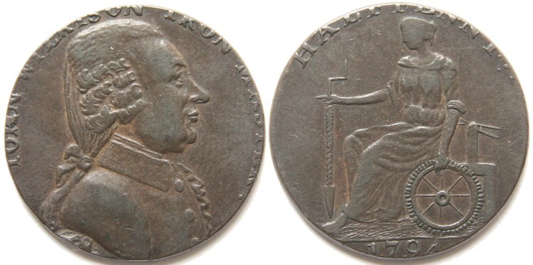 John Wilkinson's (Warwickshire) copper Evasion halfpenny token dated 1794. Obverse: Bust of John Wilkinson with misspelt name and legend: “IOHN WILKISON IRON MASTER.”. Reverse: Genius seated with auger and cog wheel with legend: “HALFPENNY 1794”. Plain edge. Also listed in Cobwright as an evasion piece. Nice collectable condition for type, see photograph. D&H Warwickshire No: 474, Cobwright No: I.0080/H.0015, Not in Atkins. Diameter 26.8mm. VF+. £25.00 e-mail David at enquiries@abccoinsandtokens.com to order. |