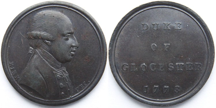 Duke of Gloucester Sentimental Magazine Medallion 1773. Obverse: Bust to left with "KIRK FEC" either side. Reverse: Legend and date on four lines: "DUKE OF GLOCESTER 1773". Plain edge. Good collectable condition, see photograph. Withers' TB3 No: 2996, BHM No: 169. Diameter 25.3mm. VF+. £25.00 e-mail David at enquiries@abccoinsandtokens.com to order. |