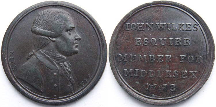 John Wilkes Sentimental Magazine Medallion 1773. Obverse: Bust to left with "KIRK FEC" either side. Reverse: Legend and date on five lines: "IOHN WILKES ESQUIRE MEMBER FOR MIDDLESEX 1773". Plain edge. Good collectable condition, see photograph. Withers' TB3 No: 3000, BHM No: 182. Diameter 25.3mm. VF+. £25.00 e-mail David at enquiries@abccoinsandtokens.com to order. |