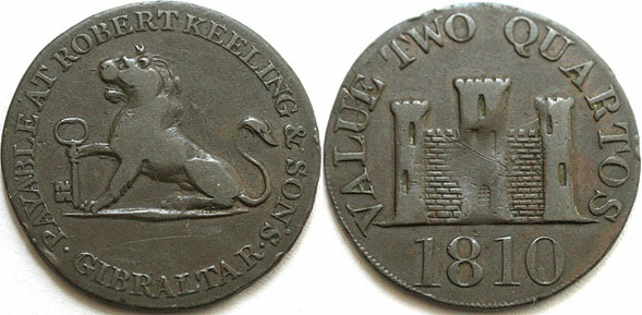 Keeling's Gibraltar copper two quartos dated 1810, large date. Obverse: Nice view of lion seated to left with paw on city key and legend: “PAYABLE AT ROBERT KEELING & SONS • GIBRALTAR•”. Reverse: Three turreted castle and portcullis with date below and legend: “VALUE TWO QUARTOS 1810”. These were issued by Robert Keeling, a local merchant, in an attempt to alleviate the local shortage of small denomination currency. Twenty-four quarts made up one real. Good collectable condition with a couple of light scratches, see photograph. KM Gibraltar No: Tn.4.1. Diameter 27.2mm. F+. £35.00 e-mail David at enquiries@abccoinsandtokens.com to order. |