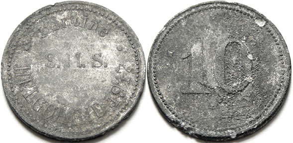 German Dreadnought S. M. S. Helgoland zinc? ten pfennig canteen token. Obverse: Legend on three lines, the top and bottom curved: "Kantine • S. M. S. • HELGOLAND 1917". Reverse: Value in centre: "10". Reasonable collectable condition but somewhat corroded flan with slightly clearer legend than photograph indicates.