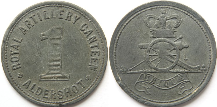 Royal Artillery Aldershot zinc penny-size canteen token.
