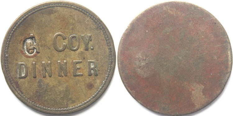 Duke of Lancaster's Yeomanry "C" Company Brass Dinner Token. John Yarwood suggests that these were issued for use by the Duke of Lancaster's Yeomanry circa 1900. Yarwood BMT 095 (076). Diameter 25.4mm. VF. £20.00 e-mail David at enquiries@abccoinsandtokens.com to order. |