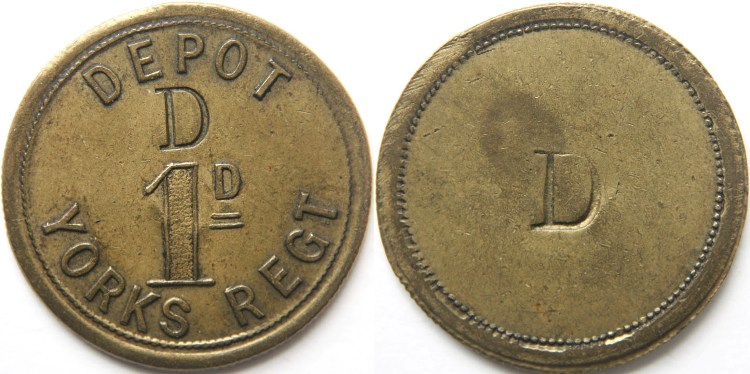 Yorkshire Regiment Depot D brass penny token with "D" c/m both sides. Yarwood Catalogue Plate Coin.