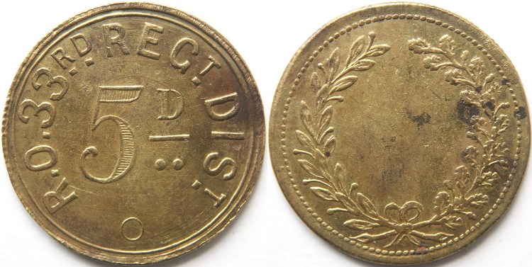 Recruiting Office 33RD Regimental District 5D Brass Token. According to John Yarwood, in the case of the 33rd Regimental District, the 33rd combined with the 76th to form The Duke of Wellington’s Regiment (West Riding). The headquarters was in Halifax, West Yorkshire. Yarwood BMT 208 (164). Diameter 30.2mm. VF+. £30.00 e-mail David at enquiries@abccoinsandtokens.com to order. |