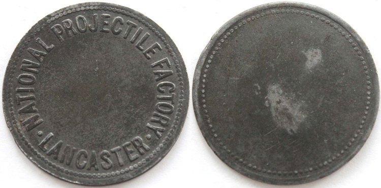 Munition factory token, undated. Obverse: Legend inside beaded circle: "NATIONAL PROJECTILE FACTORY •LANCASTER•". Reverse: Blank with beaded circle around periphery. Plain edge. Nice collectable condition, see photograph. Yarwood No: MMT 010A. Diameter 27.3mm. VF. £30.00 e-mail David at enquiries@abccoinsandtokens.com to order. |