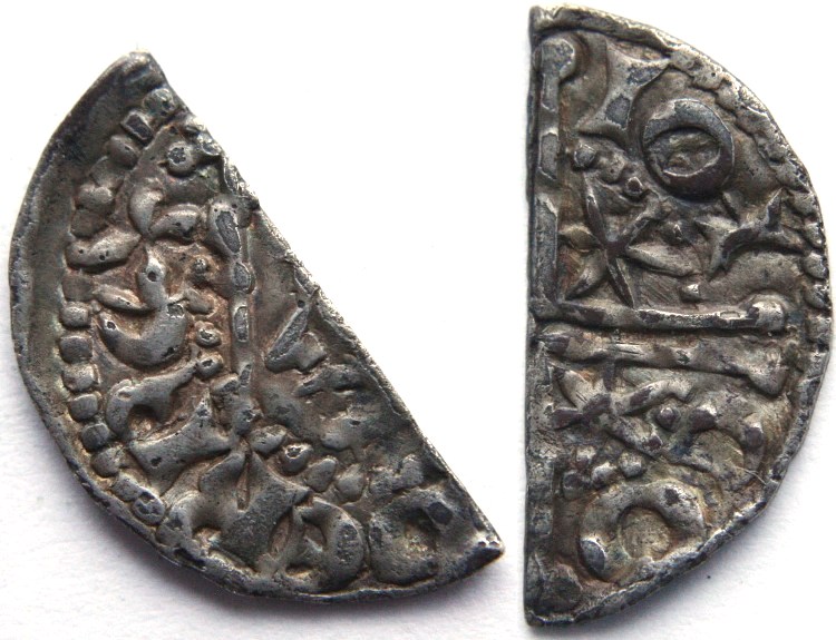Alexander III (1249-1286), First Coinage silver cut halfpenny, type III, Perth Mint, moneyer Ion Cokin. Obverse: Neat bust left with small crown: "[ALEXAN]DER REX". Reverse: Long voided cross with stars in quarters: "ION CO [KIN ON P]". Good collectable condition, see photograph. Spink No: S.5043. Diameter 18.3mm. VF. £55.00 e-mail David at enquiries@abccoinsandtokens.com to order. |