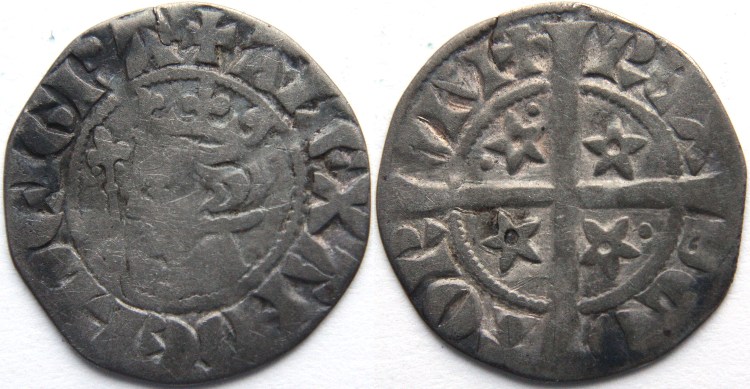 Alexander III (1249-1286), second coinage, silver penny, class E1/E. Obverse: Bust to left with pellet between "D" and "E" with legend reading: "+ALEXANDER DEI GRA". Reverse: Four mullets of five points giving a total of twenty points thus indicating a supposed mint town of Edinburgh. Legend reads: "REX SCOTORVM+" with an extra pellet in the second and two in the fourth quarters. Lettering with incurved uprights, wedge-tailed "R" and genuinely closed "C" on reverse. Reasonable collectable condition on a small flan, see photograph. Spink No: S.5056. Diameter 18.3mm. F-. £80.00 e-mail David at enquiries@abccoinsandtokens.com to order. |