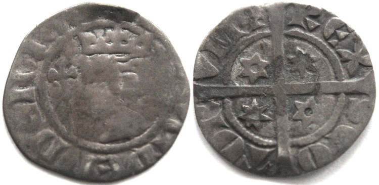 Alexander III (1249-1286), silver penny, second coinage, class E2/E with unbarred "A" and incurved uprights. Two mullets of six points and two stars of seven points giving a total of twenty-six points thus indicating a supposed mint town of Perth. Reasonable collectable condition a small flan, see photograph. Spink No: S.5056. Diameter 18.6mm. F-. £50.00 e-mail David at enquiries@abccoinsandtokens.com to order. |