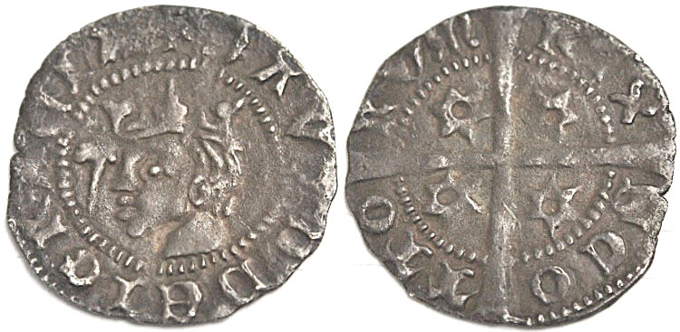 David II (1329-1371), silver penny, first coinage, second issue (after c.1333) with a mixture of letter sizes in the legends, note the large "E" on the obverse. These were issued without mint or privy marks but are thought to have been minted in Edinburgh. Obverse: Bust type 6 with sceptre and legend: "+DAVID DEI GRACIA". Reverse: Long cross with pierced mullets of six points in each quarter and legend: "REX SCOTTORVM". Nice collectable condition for type with strong portrait, see photograph. Spink No: S.5088. Diameter 17.6mm. VF. £295.00 e-mail David at enquiries@abccoinsandtokens.com to order. |