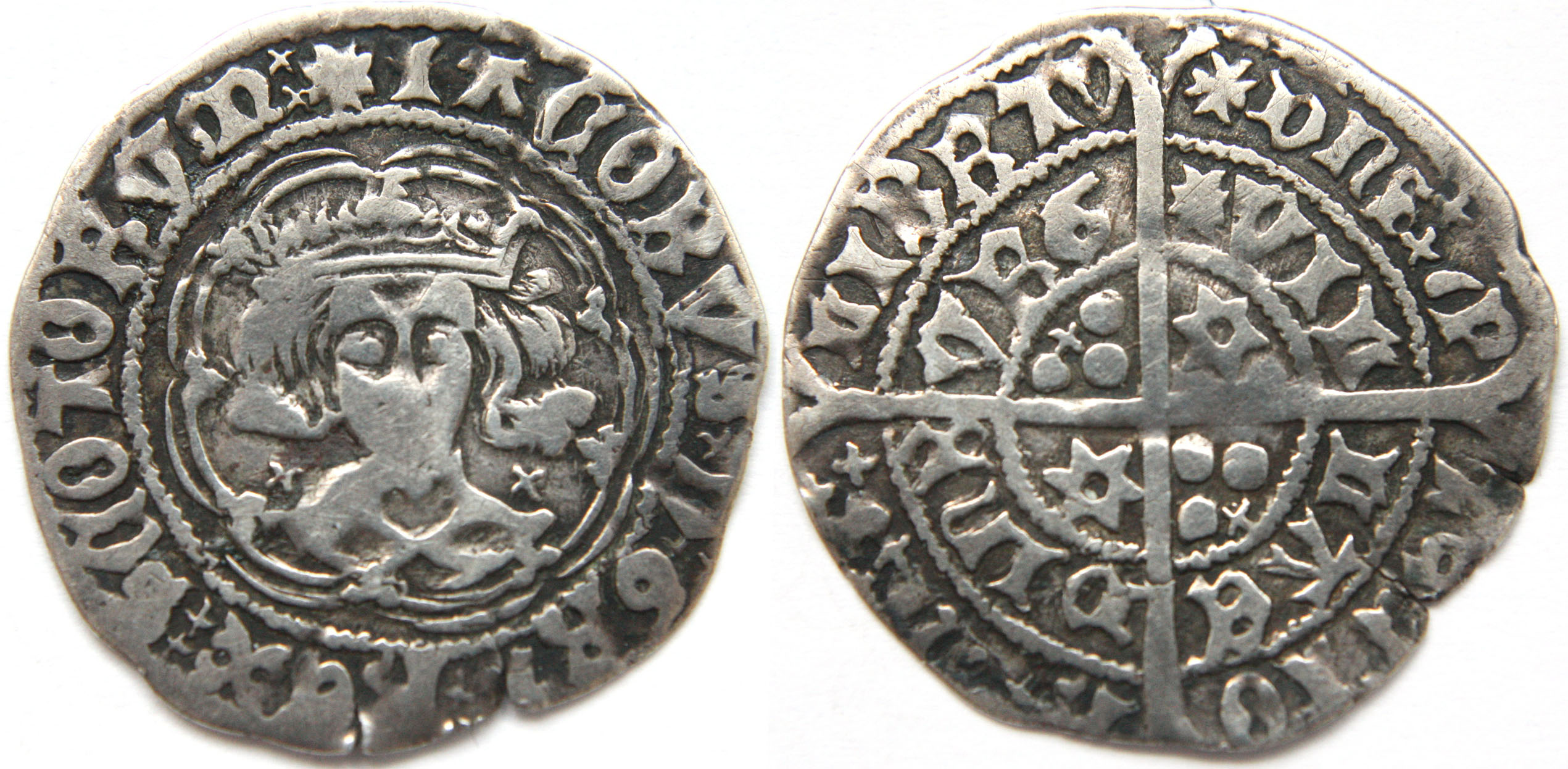James III (1460-1488), silver groat (twelve pence), Light Issue I (c.1467), Edinburgh mint. Obverse: Tressure of nine arcs with facing crowned bust and saltires either side of neck, mm cross pattée and double saltire stops. Legend: "+IACOBVS D GRA REX SCOTORVM", note the "X" is on its side. Reverse: Alternate triple pellets with saltires in centre and pierced mullets of six points and legend with double saltire stops. Outer legend: "+DNS P | TECTO | R MS § | LIBRTV". Inner legend: "+VIL | LA E | DINB | VRG". Very rare coin in good collectable condition, has been cleaned in the past, see photograph. Burns Fig 561. Spink No: S.5263. Diameter: 24.4mm. Weight: 2.330g, 35.98gr. F+. £625.00. e-mail David at enquiries@abccoinsandtokens.com to order. |
