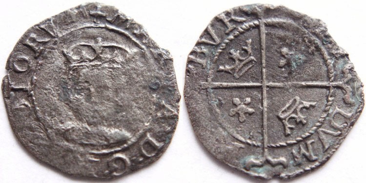 Mary Queen of Scots (1542-1567) First Period (1542-1558) billon penny. Obverse: Facing bust of the young Queen with legend: "+MARIA • D • G • R • SCOTORVM", (Mary by the grace of God Queen of Scots). Reverse: Long cross with cinquefoils in first and third quarters and crowns in second and fourth with legend: OPIDVM DINBVR", (Town of Edinburgh). The cinquefoils refer to the Earl of Arran who was acting as Regent while Mary was still under age. Good collectable condition for type with weak strike in places and a little inert verdegris, see photograph. Spink No: S.5440. Diameter 14.2mm. F/VF. £750.00 e-mail David at enquiries@abccoinsandtokens.com to order. |