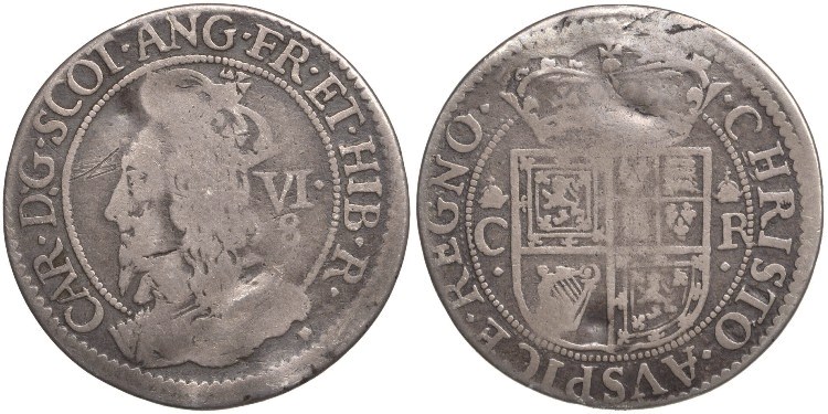 Charles I (1625-1649) silver half merk (six shillings and eight pence / eighty pence), Third Coinage, Briot's issue. Obverse: Crowned bust to left with lozenge to right of value only: "VI ◊" and "8" below, indicating denomination, behind the head and legend: "CAR • D:G • SCOT • ANG • FR • ET • HIB • R • B" (Charles by the grace of God King of Scotland England France and Ireland) with "B" below bust. Reverse: Crown over royal shield dividing crowned "C - R" with lozenge below either side and legend: "• CHRISTO • AVSPICE • REGNO •" (I reign under the auspices of Christ) with "B" above left side of crown. Reasonable collectable condition for type with a couple of dings, see photograph. Murray Obv: 5(ii) Rev: 3(b), Spink No: 5573. Diameter 25.1mm. F. £115.00 e-mail David at enquiries@abccoinsandtokens.com to order. |