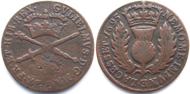William II (1694-1702) copper turner dated 1695, flat crossed sword and sceptre. Reasonable collectable condition for type, see photograph.