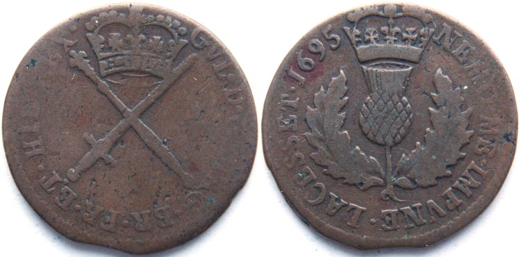 William II (1694-1702) copper turner dated 1695, high crossed sword and sceptre. Reasonable collectable condition with better reverse, see photograph. Spink No: 5697. Diameter 19.2mm. F-/F. £50.00 e-mail David at enquiries@abccoinsandtokens.com to order. |
