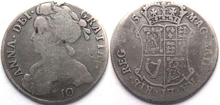 Anne (1702-1714) silver ten shillings dated 1705. Obverse: Bust to left with value "10" below and legend: "ANNA • DEI • GRATIA •". Reverse: Crowned Royal Coat of Arms in centre with legend: "MAG • BRIT • FRA •ET • HIB • REG •1705 •". Reasonable collectable condition, see photograph. Spink No: S.5700. Diameter 23.4mm. F-. £175.00 e-mail David at enquiries@abccoinsandtokens.com to order. |